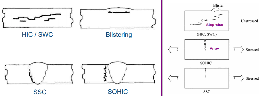Apart from SSCC, H2S also cause other cracking, including stress corrosion cracking (SCC), hydrogen-induced cracking (HIC) and stepwise cracking (SWC), stress-oriented hydrogen induced cracking (SOHIC), soft zone cracking (SZC) and galvanically induced hydrogen stress cracking.