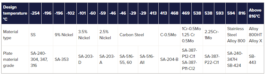 For nonhydrogen or corrosive service, the material is selected according to the design temperature. The usual selection for plate materials is shown in the table below: