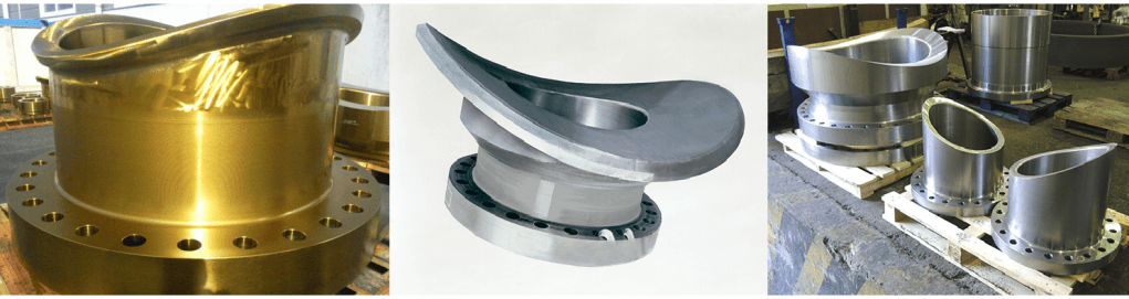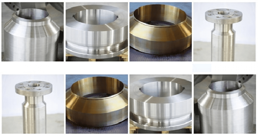 Self-reinforced forged nozzles are nozzle necks that have extra wall thickness which avoids the needs for a reinforcing pad, and hence reduces the number of welds to the shell. The ones shown here are supplied by CHW Forge, India. Self reinforced nozzles are advisable at high temperature (>370°C), high pressure (>70 bar), H2 service, low-alloy steel (Cr-Mo) vessels, wall thickness >50 mm, to reduce the number of welds to the shell.