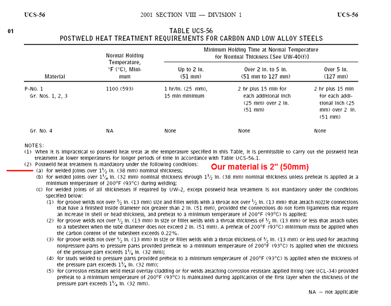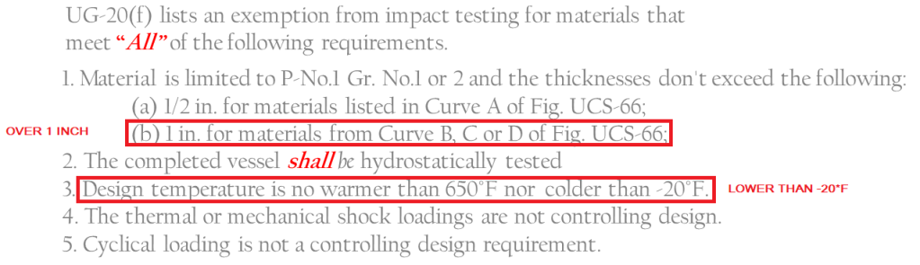 Explanation: See UG-20(f), Our material applies to Curve D of Figure UCS-66 and exceeds the 1″ limit for exemption. It also exceeds and lower temperature limits – 20 °F.