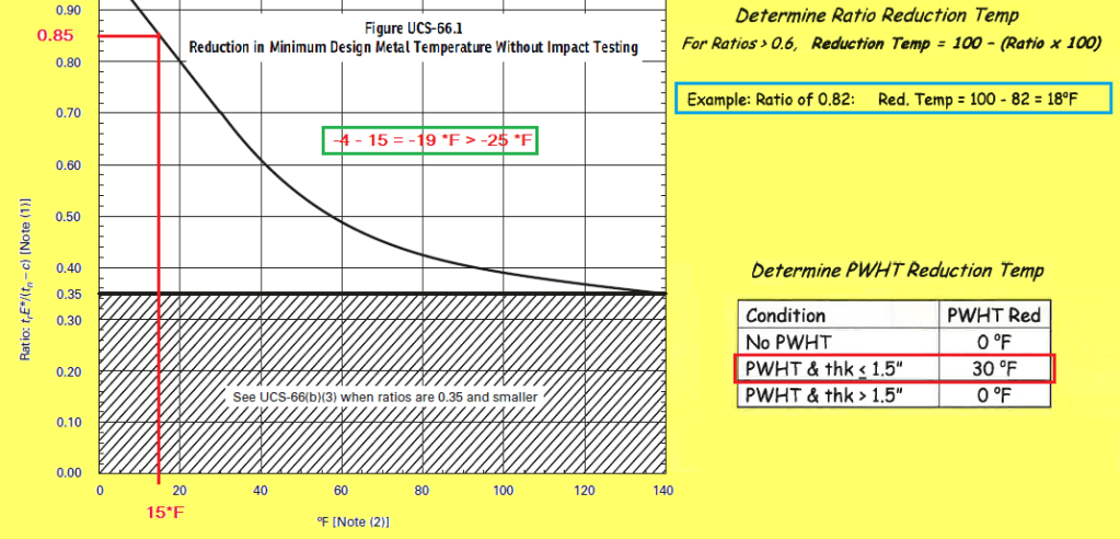 Explanation: Step 1: See Figure UCS – 66, Our material applies with thickness 2″, then the minimum temperature that exempt for impact test is initiated at – 4 °F. Step 2: See Figure UCS – 66.1, Using coincident ratio 0.85 found additional reduction in MDMT is -15*F, mean of -19*F in total.