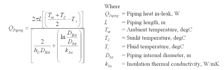 where Q is the total heat loss (W or J/s); L is the length of pipe (m); Ti is the temperature of the fluid inside the pipe (Deg.C); To is the temperature of outside environment (Deg.C); r1 is the inside radius of pipe (m); r2 is the outside radius of pipe (m); r3 is the outside radius of insulation (m); hi is the inside film heat transfer coefficient (W/m2K); hc is the outside convective film heat transfer coefficient (W/m2K); kpipe is the thermal conductivity of pipe material (W/mK), and kinsulation is the thermal conductivity of insulating material (W/mK).