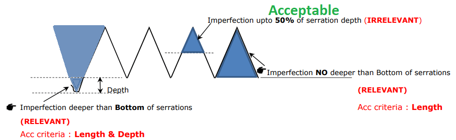 The issue with this requirement is that it allows a flaw across the full surface finish to half the serration depth. It also allows a flaw to full serration depth across anywhere from 0.12 to 0.5 inches in the radial direction, depending on flange size. It also allows a defect in the flange surface finish of between 0.06 and 0.25 inches deep, with the same radial width. The latter two limits correspond, respectively, to defects that are the serration depth and approximately one half of the gasket width for a spiral wound gasket and significantly deeper than the serrations and one quarter of the gasket width for a spiral wound.