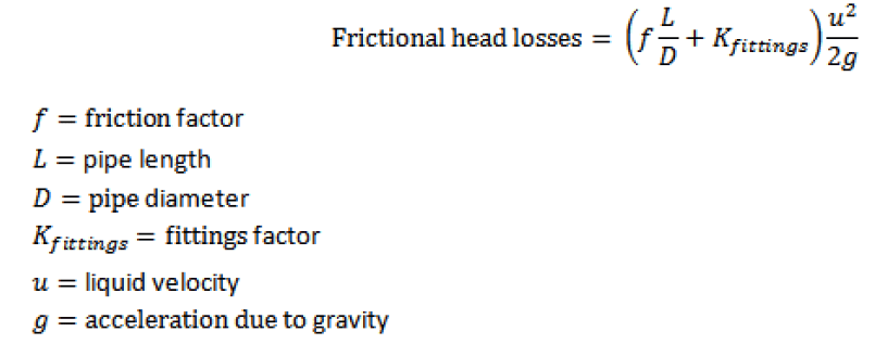 The total frictional head losses in a system are comprised of the frictional losses in the suction piping system and the frictional losses in the discharge piping system. Frictional head losses = frictional losses in suction piping system + frictional losses in discharge piping system The frictional losses in the suction and discharge piping systems are the sum of the frictional losses due to the liquid flowing through the pipes, fittings and equipment. The frictional head losses are usually calculated from the Darcy-Weisbach equation using friction factors and fittings factors to calculate the pressure loss in pipes and fittings. Darcy-Weisbach equation: