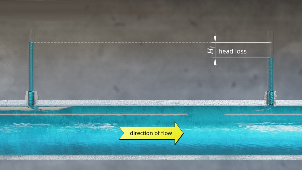Even in a horizontal pipe, friction inevitably occur due to the viscosity of the fluid. In this case, the associated head loss can indeed be shown very clearly. One can imagine small vertical tubes attached to the pipe. Due to the static pressure in the flowing liquid, the fluid in the vertical tubes is pressed upwards by a certain amount. Due to the friction losses in the pipe, however, the static pressure downstream decreases (assuming a constant pipe cross-section). The fluid in a downstream tube only reaches a lower height. The difference in the liquid levels corresponds to the head loss of the horizontal pipe.