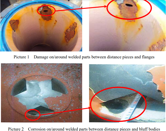 Based on the circumstances of the situation, the damage is assumed to begin at locations on welded parts where the paint has been peeled off. The underlying surface is thus directly exposed to discharge water, and it causes corrosion that then spreads over the distance pieces over time.