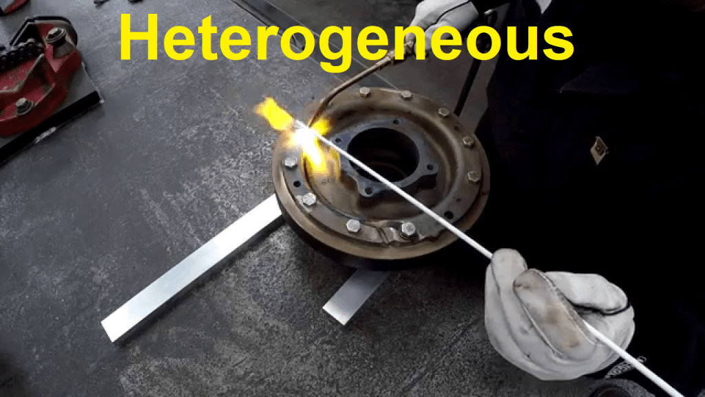 Heterogeneous welding is one way of performing fusion welding with the application of external filler whose metallurgical composition is substantially different from that of the base metals. So if filler material is applied during joining and the metallurgical composition of filler is different from that of the base metal then it is termed as heterogeneous welding. It is to be noted that heterogeneous welding is not a particular type of welding process like SMAW, TIG, GMAW, etc.; instead, it is one of the three different modes or ways of doing fusion welding.