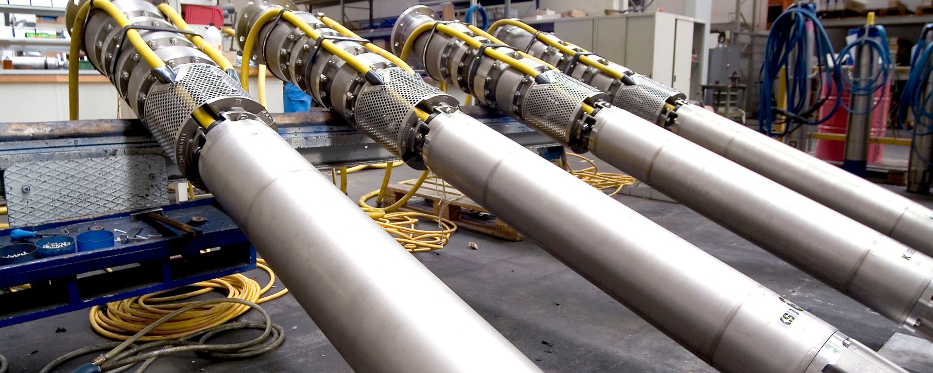 A submersible pump is an equipment that pushes the fluid to the surface instead of pulling it out. This pump has a sealed motor coupled with the pump’s body that pushes the liquid to the surface. Submersible pumps are mainly used for pumping water. They push water to the surface by converting the rotational movement (speed) into kinetic energy, and the runner blades further convert this kinetic energy into pressure.