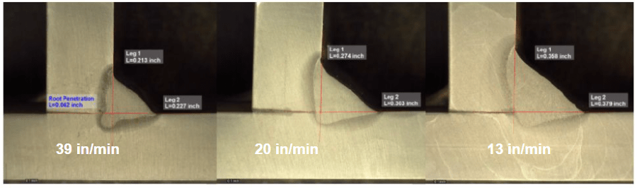 This same deposition rate would require a travel speed of 35 inches per minute to make a 3/16” fillet weld. And a travel speed of 13 inches per minute to make a 5/16-inch fillet weld.